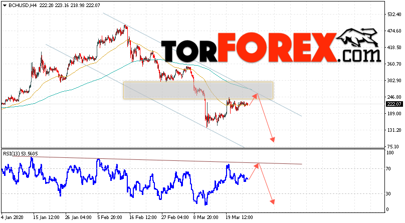 Дополнительным сигнальном в пользу падения котировок цифрового актива BCH/USD тест линии тренда на индикаторе относительной силы (RSI). Вторым сигналом в пользу падения котировок BCH/USD станет отскок от верхней границы нисходящего канала. Отменой варианта падения курса криптовалюты Bitcoin Cash 27 марта 2020 года станет сильный рост и пробой области 305.05. Это укажет на пробой области сопротивления и продолжение роста курса криптовалюты с потенциальной целью выше области 375.05. С пробоем области поддержки и закрытием котировок ниже уровня 175.05 стоит ожидать подтверждения развития нисходящей тенденции по Bitcoin Cash.