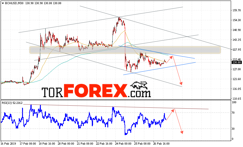 Таким образом, Bitcoin Cash прогноз и аналитика на 28 февраля 2019 предполагает попытку теста области сопротивления вблизи уровня 135. Откуда стоит ожидать отскок и продолжения падения BCH/USD в область ниже уровня 115. Дополнительным сигналом в пользу снижения Bitcoin Cash выступит тест линии тренда на индикаторе относительной силы. Отменой варианта падения станет сильный рост и пробой области 145. Это укажет на продолжение подъёма криптовалюты с потенциальной целью выше уровня 165.