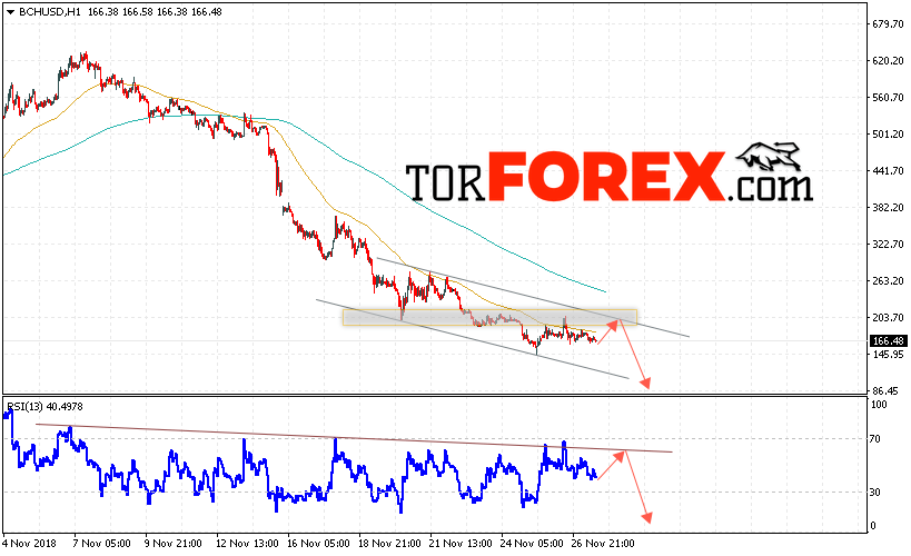 В пользу снижения котировок BCH/USD выступит тест линии тренда на индикаторе относительной силы. А также отскок от верхней границы нисходящего канала. Отменой варианта падения курса Биткион Кэш станет сильный рост и пробой области 225. Это укажет на пробой области сопротивления и продолжения роста курса криптовалюты. С пробоем области поддержки и закрытием котировок ниже уровня 135 стоит ожидать подтверждения развития нисходящей тенденции по Bitcoin Cash.