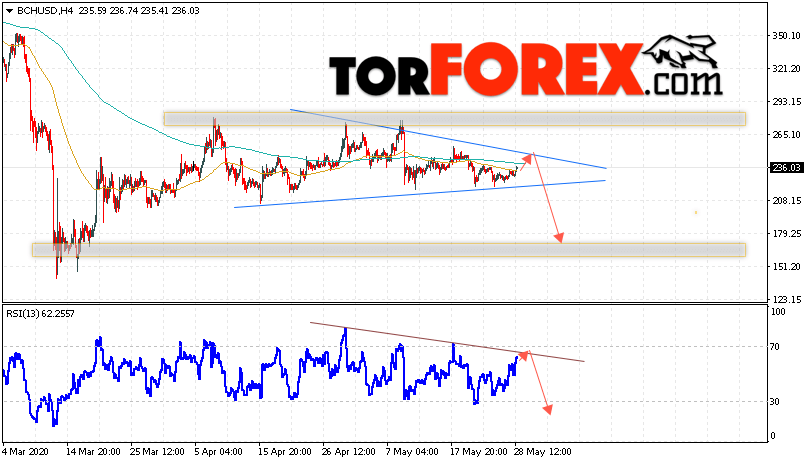 Дополнительным сигнальном в пользу падения котировок цифрового актива BCH/USD тест линии тренда на индикаторе относительной силы (RSI). Вторым сигналом в пользу снижения котировок BCH/USD станет отскок от верхней границы модели «Треугольник». Отменой варианта падения курса криптовалюты Bitcoin Cash 29 мая 2020 года станет сильный рост и пробой области 265.05. Это укажет на пробой области сопротивления и продолжение роста курса криптовалюты с потенциальной целью выше области 305.05. С пробоем области поддержки и закрытием котировок ниже уровня 205.05 стоит ожидать подтверждения развития восходящей тенденции по Bitcoin Cash.
