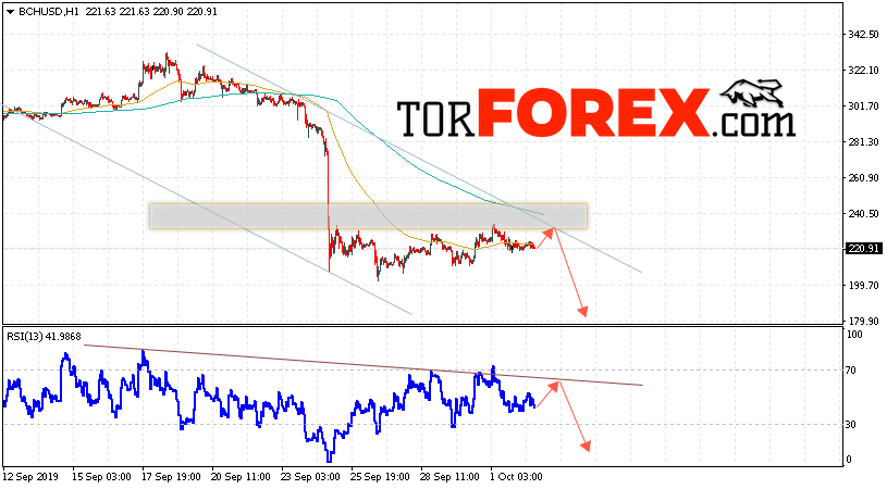 Дополнительным сигнальном в пользу падения котировок цифрового актива BCH/USD выступит тест нисходящей линии тренда на индикаторе относительной силы (RSI). Вторым сигналом в пользу снижения котировок BCH/USD станет отскок от верхней границы нисходящего канала. Отменой варианта падения курса криптовалюты Bitcoin Cash 3 октября 2019 года станет сильный рост и пробой области 255.05. Это укажет на пробой верхней границы нисходящего канала и продолжение роста курса криптовалюты с потенциальной целью выше области 285.55. С пробоем области поддержки и закрытием котировок ниже уровня 195.05 стоит ожидать подтверждения развития нисходящей тенденции по Bitcoin Cash.