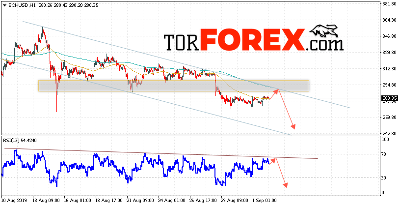 Дополнительным сигнальном в пользу снижения котировок BCH/USD выступит тест нисходящей линии тренда на индикаторе относительной силы (RSI). Вторым сигналом в пользу падения котировок BCH/USD станет отскок от верхней границы нисходящего канала. Отменой варианта падения курса криптовалюты Bitcoin Cash 3 сентября 2019 года станет сильный рост и пробой области 305.00. Это укажет на пробой верхней границы медвежьего канала и продолжение роста курса криптовалюты с потенциальной целью выше области 365.00. С пробоем области поддержки и закрытием котировок ниже уровня 260.05 стоит ожидать подтверждения развития нисходящей тенденции по Bitcoin Cash.
