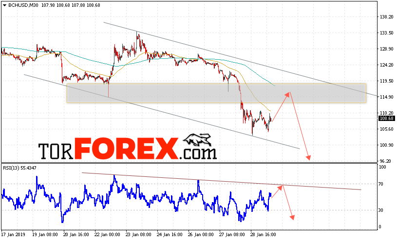 Таким образом, Bitcoin Cash прогноз и аналитика на 30 января 2019 предполагает попытку теста области сопротивления вблизи уровня 115. Откуда стоит ожидать отскок и продолжения падения BCH/USD в область ниже уровня 90. Дополнительным сигналом в пользу снижения Bitcoin Cash выступит тест линии тренда на индикаторе относительной силы. Отменой варианта падения станет сильный рост и пробой области 125. Это укажет на продолжение подъёма криптовалюты с потенциальной целью выше уровня 155.