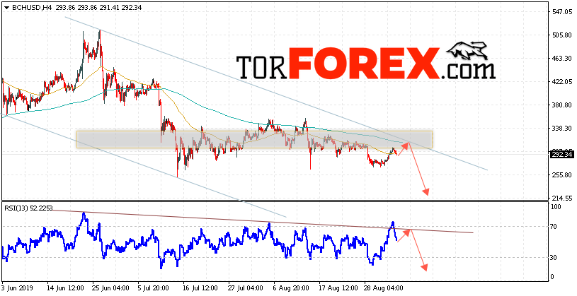Дополнительным сигнальном в пользу снижения котировок BCH/USD выступит тест нисходящей линии тренда на индикаторе относительной силы (RSI). Вторым сигналом в пользу падения котировок BCH/USD станет отскок от верхней границы нисходящего канала. Отменой варианта падения курса криптовалюты Bitcoin Cash 5 сентября 2019 года станет сильный рост и пробой области 335.00. Это укажет на пробой верхней границы медвежьего канала и продолжение роста курса криптовалюты с потенциальной целью выше области 365.00. С пробоем области поддержки и закрытием котировок ниже уровня 255.05 стоит ожидать подтверждения развития нисходящей тенденции по Bitcoin Cash.
