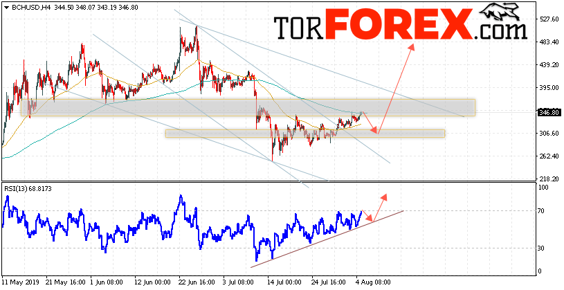 Дополнительным сигнальном в пользу роста котировок BCH/USD выступит тест восходящей линии тренда на индикаторе относительной силы. Вторым сигналом в пользу роста котировок BCH/USD станет отскок от верхней границы нисходящего канала. Отменой варианта роста курса криптовалюты Bitcoin Cash завтра 2 августа 2019 года станет падение и пробой области 270.00. Это укажет на пробой области поддержки и продолжение падения курса криптовалюты с потенциальной целью ниже области 235.00. С пробоем области сопротивления и закрытием котировок выше уровня 400.00 стоит ожидать ускорения развития восходящей тенденции по Bitcoin Cash.