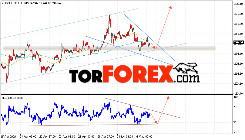 Дополнительным сигнальном в пользу подъёма котировок цифрового актива BCH/USD тест линии тренда на индикаторе относительной силы (RSI). Вторым сигналом в пользу роста котировок BCH/USD станет отскок от нижней границы восходящего канала. Отменой варианта подъёма курса криптовалюты Bitcoin Cash 6 мая 2020 года станет падение и пробой области 215.05. Это укажет на пробой области поддержки и продолжение падения курса криптовалюты с потенциальной целью ниже области 205.05. С пробоем области сопротивления и закрытием котировок выше уровня 265.05 стоит ожидать подтверждения развития восходящей тенденции по Bitcoin Cash.