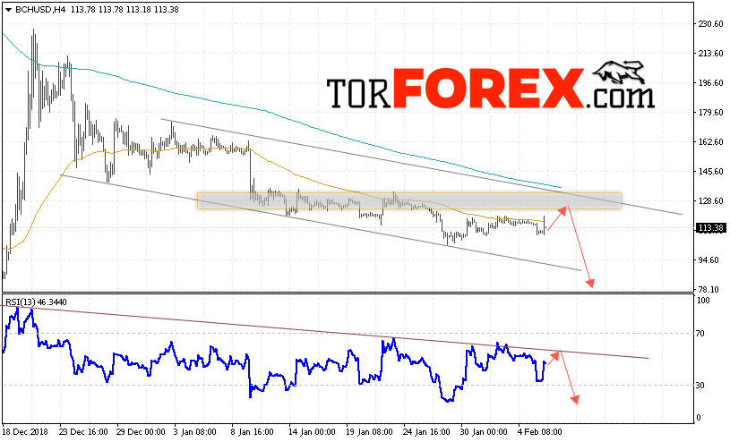 В пользу снижения котировок BCH/USD выступит тест нисходящей линии тренда на индикаторе относительной силы. А также отскок от верхней границы нисходящего канала. Отменой варианта падения курса Bitcoin Cash станет сильный рост и пробой области 140. Это укажет на пробой верхней границы канала и продолжения роста курса криптовалюты с целью ниже области 165. С пробоем области поддержки и закрытием котировок ниже уровня 105 стоит ожидать подтверждения развития нисходящей тенденции по Bitcoin Cash.