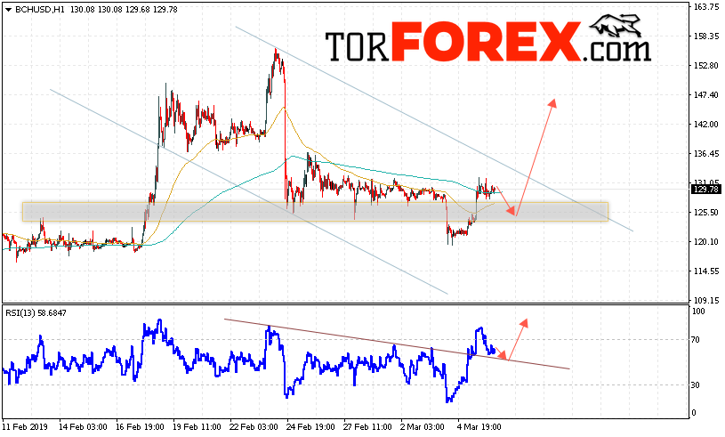 В пользу подъёма котировок BCH/USD выступит тест пробитой линии тренда на индикаторе относительной силы. Отменой варианта роста курса Bitcoin Cash станет падение и пробой области 120. Это укажет на пробой области поддержки и продолжения падения курса криптовалюты с целью ниже области 100. С пробоем верхней границы нисходящего канала и закрытием котировок выше уровня 135 стоит ожидать подтверждения развития восходящей тенденции по Bitcoin Cash.