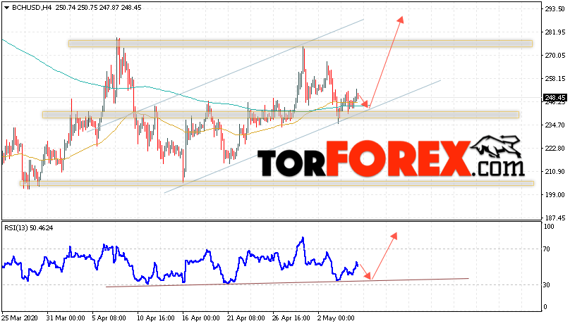 Дополнительным сигнальном в пользу подъёма котировок цифрового актива BCH/USD тест линии тренда на индикаторе относительной силы (RSI). Вторым сигналом в пользу роста котировок BCH/USD станет отскок от нижней границы восходящего канала. Отменой варианта подъёма курса криптовалюты Bitcoin Cash 7 мая 2020 года станет падение и пробой области 230.05. Это укажет на пробой области поддержки и продолжение падения курса криптовалюты с потенциальной целью ниже области 195.05. С пробоем области сопротивления и закрытием котировок выше уровня 265.05 стоит ожидать подтверждения развития восходящей тенденции по Bitcoin Cash.