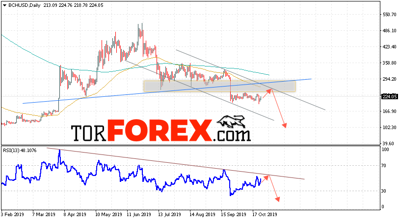 Таким образом, Bitcoin Cash прогноз курса на 28 октября — 1 ноября 2019 предполагает попытку теста области сопротивления вблизи уровня 240.05. Затем продолжение падения в область ниже уровня 105.05. Дополнительным сигналом в пользу падения Bitcoin Cash выступит тест пробитой линии тренда на индикаторе относительной силы. Отменой варианта снижения станет сильный рост и пробой области 305.00. Это укажет на продолжение подъёма криптовалюты с целью выше уровня 365.00.
