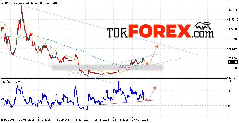 Дополнительным сигналом в пользу подъёма котировок BCH/USD на текущей торговой неделю 1 — 5 июля 2019 выступит тест линии поддержки на индикаторе относительной силы. Вторым сигналом станет отскок от нижней границы восходящего канала. Отменой варианта роста криптовалюты Bitcoin Cash станет падение и пробой области 270.00. Это укажет на пробой нижней границы восходящего канала и продолжение падения котировок BCH/USD. Подтверждением роста криптовалюты выступит пробой области сопротивления и закрытие котировок выше уровня 515.00.