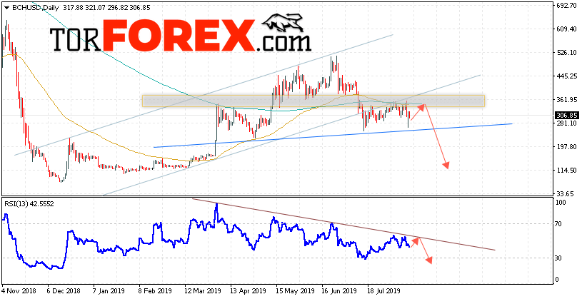 Дополнительным сигналом в пользу падения котировок BCH/USD на текущей торговой неделю 19 — 23 августа 2019 выступит тест линии сопротивления на индикаторе относительной силы. Вторым сигналом станет отскок от нижней границы восходящего канала. Отменой варианта снижения криптовалюты Bitcoin Cash станет сильный рост и пробой области 445.00. Это укажет на пробой нижней границы восходящего канала и продолжение роста котировок BCH/USD. Подтверждением снижения криптовалюты выступит пробой области поддержки и закрытие котировок ниже уровня 265.00.