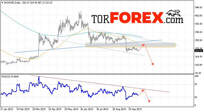 Таким образом, Bitcoin Cash прогноз курса на неделю 21 — 25 октября 2019 предполагает попытку теста области сопротивления вблизи уровня 235.05. Затем продолжение падения в область ниже уровня 105.05. Дополнительным сигналом в пользу падения Bitcoin Cash выступит тест пробитой линии тренда на индикаторе относительной силы. Отменой варианта снижения станет сильный рост и пробой области 305.00. Это укажет на продолжение подъёма криптовалюты с целью выше уровня 365.00.