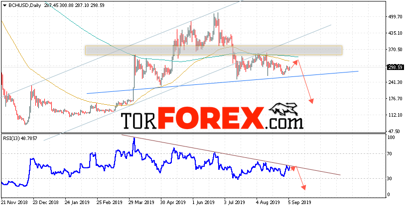 Дополнительным сигналом в пользу падения котировок BCH/USD на текущей торговой неделю 9 — 13 сентября 2019 выступит тест линии сопротивления на индикаторе относительной силы. Вторым сигналом станет формирование разворотной модели. Отменой варианта снижения криптовалюты Bitcoin Cash станет сильный рост и пробой области 405.00. Это укажет на пробой уровня сопротивления и продолжение роста котировок BCH/USD. Подтверждением снижения криптовалюты выступит пробой области поддержки и закрытие котировок ниже уровня 225.00.