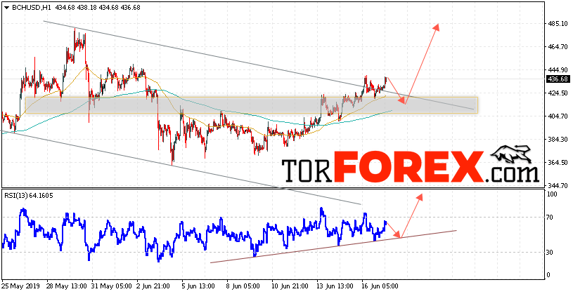 Дополнительным сигнальном в пользу роста котировок BCH/USD выступит тест пробитой линии тренда на индикаторе относительной силы. Вторым сигналом в пользу подъёма котировок BCH/USD станет отскок от верхней границы нисходящего канала. Отменой варианта роста курса криптовалюты Bitcoin Cash станет сильное падение и пробой области 385.05. Это укажет на пробой границы канала и продолжение падения курса криптовалюты с потенциальной целью ниже области 310.00. С пробоем области сопротивления и закрытием котировок выше уровня 450.00 стоит ожидать ускорения развития восходящей тенденции по Bitcoin Cash.