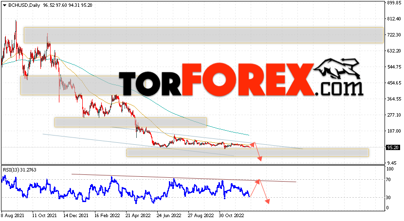 Дополнительным сигналом в пользу падения котировок BCH/USD на текущей торговой неделе 2 — 6 января 2023 выступит тест линии сопротивления на индикаторе относительной силы. Вторым сигналом станет отскок от верхней границы нисходящего канала. Отменой варианта падения криптовалюты Bitcoin Cash на следующей торговой неделе станет сильный рост и пробой области 135.05. Это укажет на пробой области сопротивления и продолжение подъёма котировок BCH/USD с целью выше уровня 225.05. Подтверждением падению криптовалюты выступит пробой области поддержки и закрытие котировок ниже уровня 80.05.