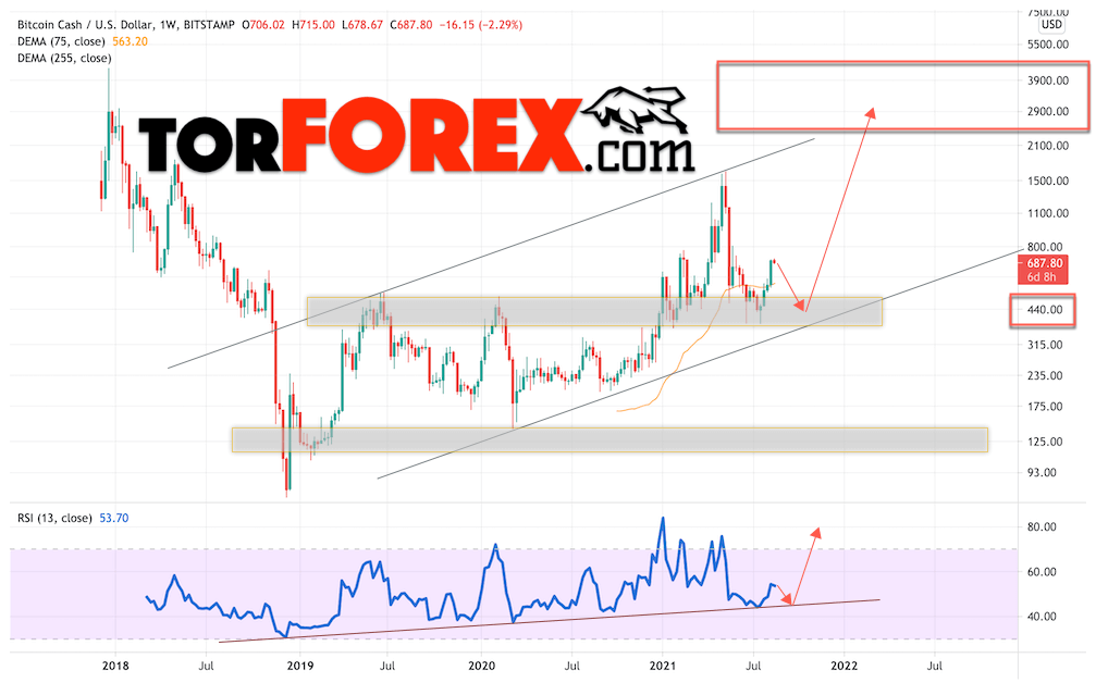 В рамках прогноза цены Bitcoin Cash на 2021 и 2022 год, актив движется в рамках бычьего канала, состоялся отскок от области поддержки. Как видим, важная область располагается вблизи уровня $440. После очередного теста этого уровня стоит ожидать отскок и продолжение подъёма курса Bitcoin Cash с потенциальной целью выше уровня $2900 в 2022 году.