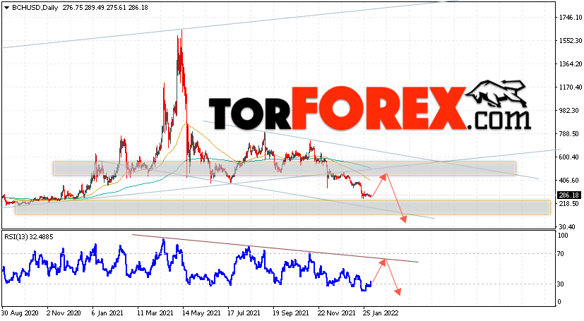 Дополнительным сигналом в пользу падения котировок BCH/USD на текущей торговой неделе 7 — 11 февраля 2022 выступит тест линии сопротивления на индикаторе относительной силы. Вторым сигналом станет отскок от нижней границы бычьего канала, который был давно пробит вниз. Отменой варианта падения криптовалюты Bitcoin Cash на следующей торговой неделе станет сильный рост и пробой области 615.05. Это укажет на пробой области сопротивления и продолжение роста котировок BCH/USD с целью выше уровня 775.05. Подтверждением падению криптовалюты выступит пробой области поддержки и закрытие котировок ниже уровня 205.05.