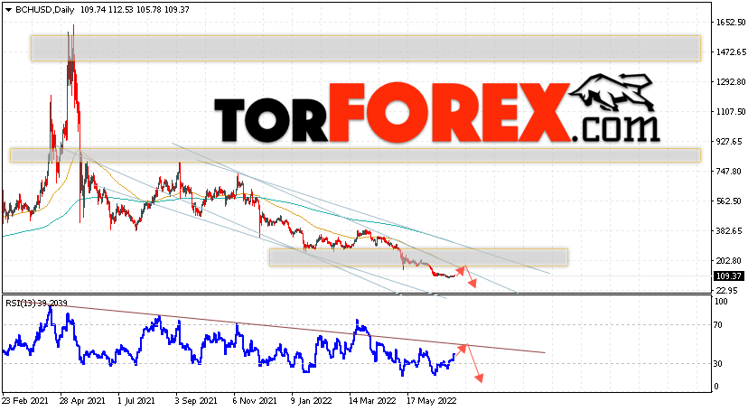 Дополнительным сигналом в пользу падения котировок BCH/USD на текущей торговой неделе 11 — 15 июля 2022 выступит тест линии сопротивления на индикаторе относительной силы. Вторым сигналом станет отскок от верхней границы нисходящего канала. Отменой варианта падения криптовалюты Bitcoin Cash на следующей торговой неделе станет сильный рост и пробой области 235.05. Это укажет на пробой области сопротивления и продолжение подъёма котировок BCH/USD с целью выше уровня 365.05. Подтверждением падению криптовалюты выступит пробой области поддержки и закрытие котировок ниже уровня 90.05.