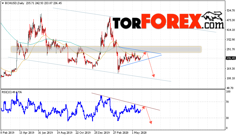 Дополнительным сигналом в пользу снижения котировок BCH/USD на текущей торговой неделе 1 — 5 июня 2020 выступит тест линии сопротивления на индикаторе относительной силы. Вторым сигналом станет отскок от верхней границы модели «Треугольник». Отменой варианта падения криптовалюты Bitcoin Cash на следущей торговой неделе станет сильный рост и пробой области 315.05. Это укажет на пробой области сопротивления и продолжение роста котировок BCH/USD с цель выше уровня 455.00. Подтверждением падения криптовалюты выступит пробой области поддержки и закрытие котировок ниже уровня 205.00.