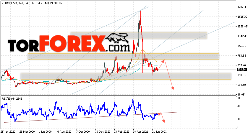 Дополнительным сигналом в пользу снижения котировок BCH/USD на текущей торговой неделе 12 — 16 июля 2021 выступит тест линии сопротивления на индикаторе относительной силы. Вторым сигналом станет отскок от области сопротивления на графике цены. Отменой варианта падения криптовалюты Bitcoin Cash на следующей торговой неделе станет сильный рост и пробой области 945.05. Это укажет на пробой области сопротивления и продолжение подъёма котировок BCH/USD с целью выше уровня 1275.05. Подтверждением снижения криптовалюты выступит пробой области поддержки и закрытие котировок ниже уровня 365.05.