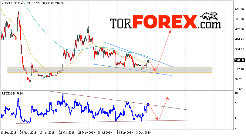 Дополнительным сигналом в пользу роста котировок BCH/USD на текущей торговой неделе 13 — 17 января 2020 выступит тест восходящей линии поддержки на индикаторе относительной силы. Вторым сигналом станет отскок от нижней границы бычьей модели «Клин». Отменой варианта роста криптовалюты Bitcoin Cash станет падение и пробой области 95.05. Это укажет на пробой области поддержки и продолжение падения котировок BCH/USD. Подтверждением роста криптовалюты выступит пробой области сопротивления и закрытием котировок выше уровня 265.05.