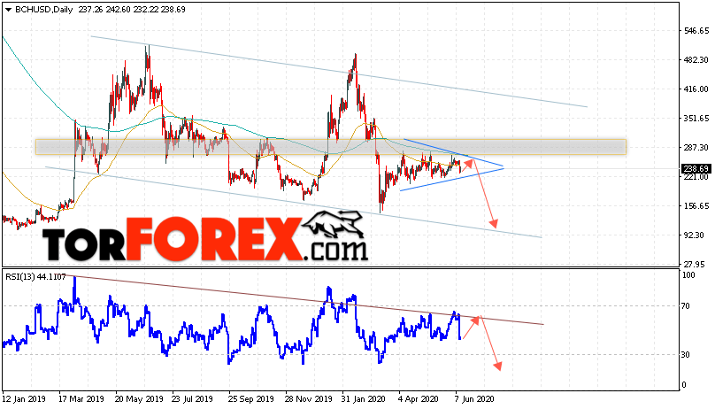 Дополнительным сигналом в пользу снижения котировок BCH/USD на текущей торговой неделе 15 — 19 июня 2020 выступит тест линии сопротивления на индикаторе относительной силы. Вторым сигналом станет отскок от верхней границы модели «Треугольник». Отменой варианта падения криптовалюты Bitcoin Cash на следущей торговой неделе станет сильный рост и пробой области 305.05. Это укажет на пробой области сопротивления и продолжение роста котировок BCH/USD с цель выше уровня 405.00. Подтверждением падения криптовалюты выступит пробой области поддержки и закрытие котировок ниже уровня 205.00.