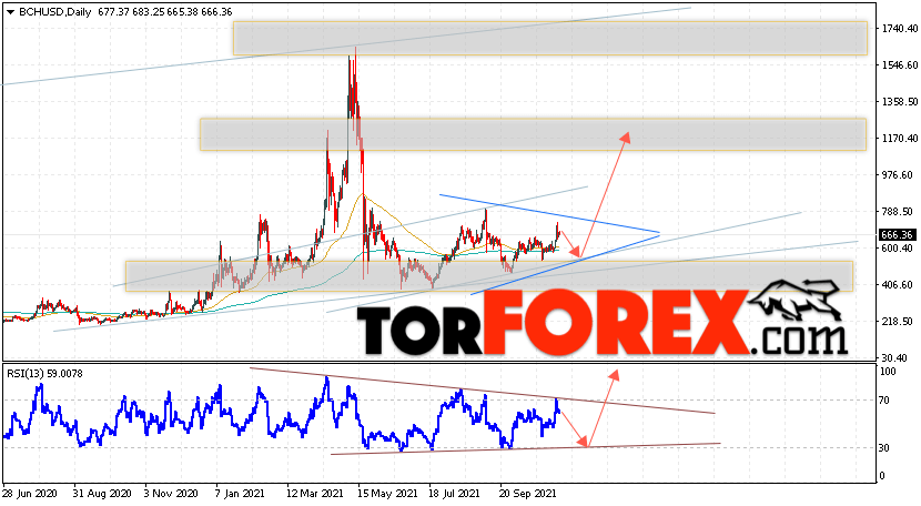 Дополнительным сигналом в пользу подъёма котировок BCH/USD на текущей торговой неделе 15 — 19 ноября 2021 выступит тест линии поддержки на индикаторе относительной силы. Вторым сигналом станет отскок от нижней границы бычьего канала. Отменой варианта подъёма криптовалюты Bitcoin Cash на следующей торговой неделе станет падение и пробой области 345.05. Это укажет на пробой области поддержки и продолжение падения котировок BCH/USD с целью ниже уровня 155.05. Подтверждением подъёму криптовалюты выступит пробой области сопротивления и закрытие котировок выше уровня 765.05, что укажет на пробой верхней границы модели ”Треугольник”.