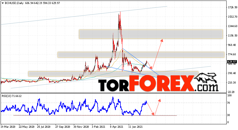 Дополнительным сигналом в пользу подъёма котировок BCH/USD на текущей торговой неделе 16 — 20 августа 2021 выступит тест линии поддержки на индикаторе относительной силы. Вторым сигналом станет отскок от верхней границы модели ”Клин”. Отменой варианта подъёма криптовалюты Bitcoin Cash на следующей торговой неделе станет падение и пробой области 385.05. Это укажет на пробой области поддержки и продолжение падения котировок BCH/USD с целью ниже уровня 165.05. Подтверждением подъёму криптовалюты выступит пробой области сопротивления и закрытие котировок выше уровня 705.05.