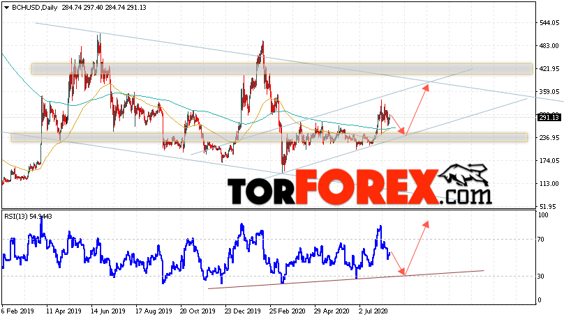 Дополнительным сигналом в пользу подъёма котировок BCH/USD на текущей торговой неделе 17 — 21 августа 2020 выступит тест линии поддержки на индикаторе относительной силы. Вторым сигналом станет отскок от нижней границы восходящего канала. Отменой варианта роста криптовалюты Bitcoin Cash на следущей торговой неделе станет падение и пробой области 185.05. Это укажет на пробой области поддержки и продолжение падения котировок BCH/USD с цель ниже уровня 135.05. Подтверждением подъёма криптовалюты выступит пробой области сопротивления и закрытие котировок выше уровня 375.05.