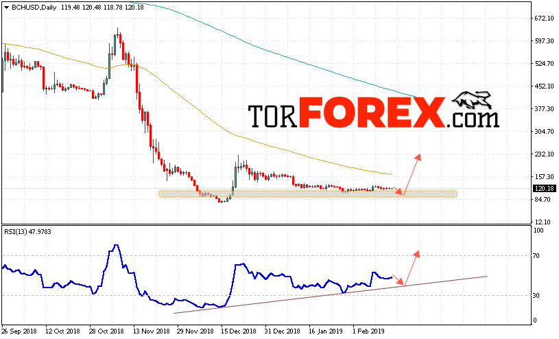 Дополнительным сигналом в пользу роста котировок BCH/USD на текущей торговой неделю 18 — 22 февраля 2019 выступит тест линии поддержки на индикаторе относительной силы. Отменой варианта роста криптовалюты Bitcoin Cash станет падение и пробой области 75. Это укажет на пробой области поддержки и продолжение падения BCH/USD. Подтверждением роста криптовалюты выступит пробой области сопротивления и закрытие котировок выше уровня 145.