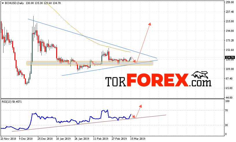 Дополнительным сигналом в пользу роста котировок BCH/USD на текущей торговой неделю 18 — 22 марта 2019 выступит тест линии поддержки на индикаторе относительной силы. Вторым сигналом станет отскок от нижней границы модели «Треугольник». Отменой варианта роста криптовалюты Bitcoin Cash станет падение и пробой области 105. Это укажет на пробой области поддержки и продолжение падения BCH/USD. Подтверждением роста криптовалюты выступит пробой области сопротивления и закрытие котировок выше уровня 155.