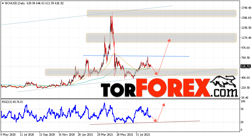Дополнительным сигналом в пользу подъёма котировок BCH/USD на текущей торговой неделе 20 — 24 сентября 2021 выступит тест линии поддержки на индикаторе относительной силы. Вторым сигналом станет отскок от нижней границы бычьего канала. Отменой варианта подъёма криптовалюты Bitcoin Cash на следующей торговой неделе станет падение и пробой области 305.05. Это укажет на пробой области поддержки и продолжение падения котировок BCH/USD с целью ниже уровня 135.05. Подтверждением подъёму криптовалюты выступит пробой области сопротивления и закрытие котировок выше уровня 855.05, что укажет на завершение формирования разворотной модели перевёрнутая ”Голова и плечи”.