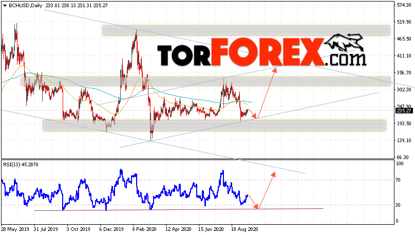 Дополнительным сигналом в пользу подъёма котировок BCH/USD на текущей торговой неделе 21 — 25 сентября 2020 выступит тест линии поддержки на индикаторе относительной силы. Вторым сигналом станет пробой нижней границы нисходящего канала. Отменой варианта роста криптовалюты Bitcoin Cash на следущей торговой неделе станет падение и пробой области 155.05. Это укажет на пробой области поддержки и продолжение падения котировок BCH/USD с цель ниже уровня 105.55. Подтверждением подъёма криптовалюты выступит пробой области сопротивления и закрытие котировок выше уровня 315.05.