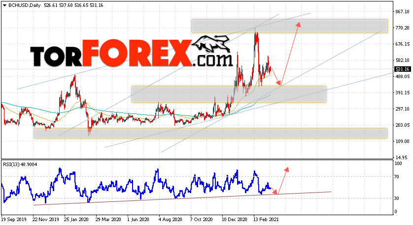 Дополнительным сигналом в пользу подъёма котировок BCH/USD на текущей торговой неделе 22 — 26 марта 2021 выступит тест линии поддержки на индикаторе относительной силы. Вторым сигналом станет отскок о нижней границы восходящего канала. Отменой варианта роста криптовалюты Bitcoin Cash на следующей торговой неделе станет спадение и пробой области 305.05. Это укажет на пробой области поддержки и продолжение падения котировок BCH/USD с целью ниже уровня 235.05. Подтверждением подъёма криптовалюты выступит пробой области сопротивления и закрытие котировок выше уровня 675.05.