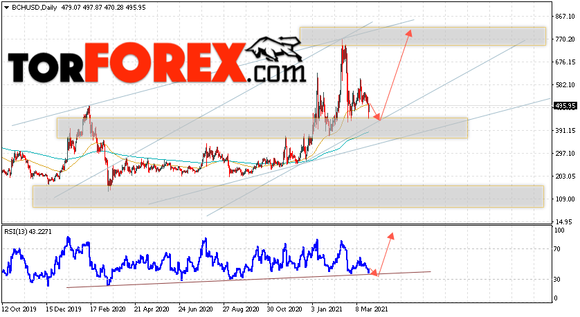 Дополнительным сигналом в пользу подъёма котировок BCH/USD на текущей торговой неделе 29 марта — 2 апреля 2021 выступит тест линии поддержки на индикаторе относительной силы. Вторым сигналом станет отскок о нижней границы восходящего канала. Отменой варианта роста криптовалюты Bitcoin Cash на следующей торговой неделе станет спадение и пробой области 305.05. Это укажет на пробой области поддержки и продолжение падения котировок BCH/USD с целью ниже уровня 240.45. Подтверждением подъёма криптовалюты выступит пробой области сопротивления и закрытие котировок выше уровня 675.05.