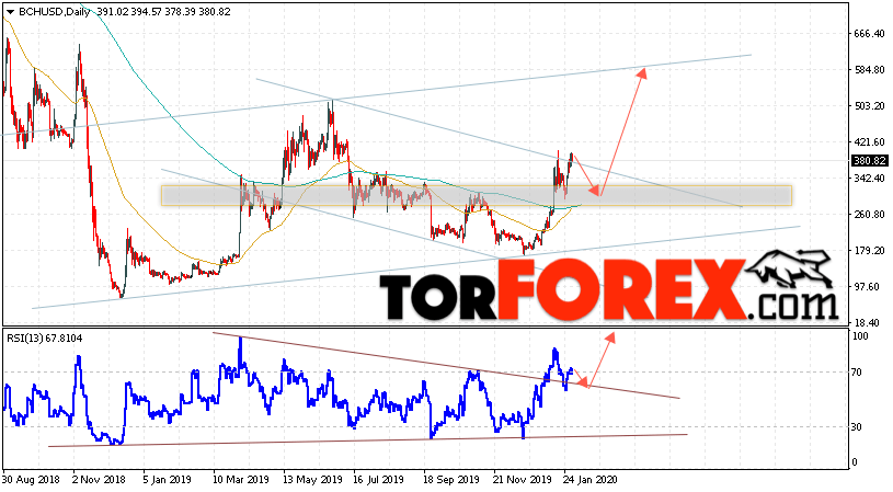 Дополнительным сигналом в пользу роста котировок BCH/USD на текущей торговой неделе 3 — 7 февраля 2020 выступит тест линии тренда на индикаторе относительной силы. Вторым сигналом станет отскок от нижней границы восходящего канала. Отменой варианта роста криптовалюты Bitcoin Cash станет падение и пробой области 165.05. Это укажет на пробой области поддержки и продолжение падения котировок BCH/USD. Подтверждением роста криптовалюты выступит пробой области сопротивления и закрытием котировок выше уровня 445.05.