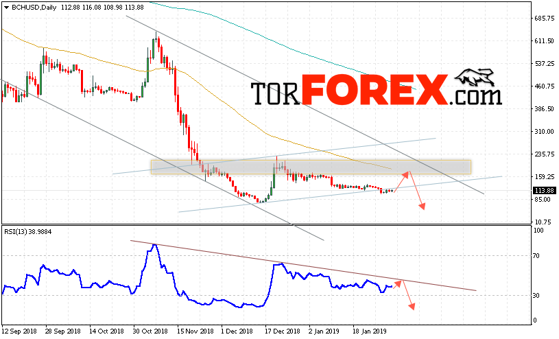 Дополнительным сигналом в пользу падения котировок BCH/USD на текущей торговой неделю 4 — 8 февраля 2019 выступит тест линии сопротивления на индикаторе относительной силы. Отменой варианта падения криптовалюты Bitcoin Cash станет сильный рост и пробой области 235. Это укажет на пробой верхней границы нисходящего канала и продолжение роста BCH/USD. Подтверждением снижения криптовалюты выступит пробой области поддержки и закрытие котировок ниже уровня 100.