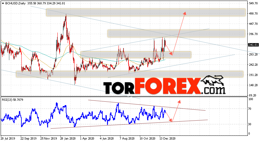 Дополнительным сигналом в пользу подъёма котировок BCH/USD на текущей торговой неделю 4 — 8 января 2021 выступит тест линии поддержки на индикаторе относительной силы. Вторым сигналом станет отскок о нижней границы восходящего канала. Отменой варианта роста криптовалюты Bitcoin Cash на следущей торговой неделе станет спадение и пробой области 205.05. Это укажет на пробой области поддержки и продолжение падения котировок BCH/USD с целью ниже уровня 125.05. Подтверждением подъёма криптовалюты выступит пробой области сопротивления и закрытие котировок выше уровня 425.05, что укажет на пробой верхней границы восходящего канала.