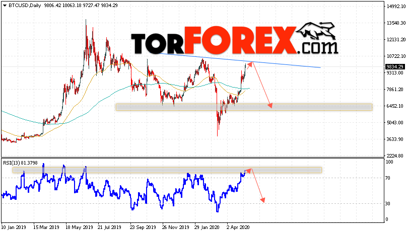Таким образом, Bitcoin прогноз и аналитика на 11 — 15 мая 2020 предполагает попытку области сопротивления вблизи уровня 10050. Затем продолжение падения криптовалюты в область ниже уровня 6455. Дополнительным сигналом в пользу снижения курса Bitcoin на текущей торговой неделе выступит тест линии сопротивления на индикаторе относительной силы. Отменой варианта падения котировок криптовалюты Bitcoin выступит сильный рост и пробой области 11005. В этом случае стоит ожидать продолжение подъёма с целью на уровне 13555.