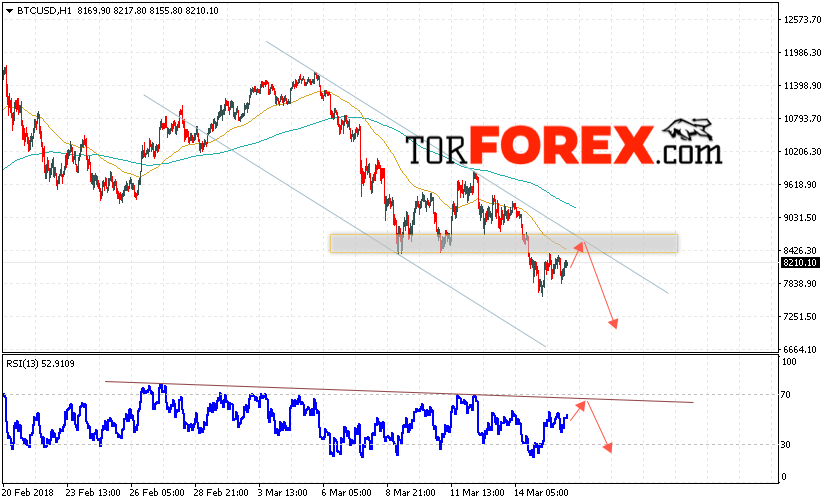 Котировки Bitcoin BTC/USD торгуются на уровне 8210 и продолжают движение в рамках нисходящей тенденции. На данный момент стоит ожидать попытку теста области сопротивления вблизи уровня 8400. Откуда вновь стоит ожидать отскок и попытку продолжения падения Bitcoin с целью ниже уровня 7000.