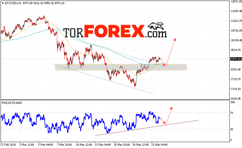 Таким образом, Bitcoin прогноз и аналитика на 23 марта 2018 предполагает попытку теста области поддержки вблизи уровня 8500 и продолжения роста с потенциальной целью на уровне 10100, дополнительным сигналом в пользу роста Bitcoin выступит тест линии тренда на индикаторе относительной силы, отменой варианта роста станет падение и пробой области 7800.