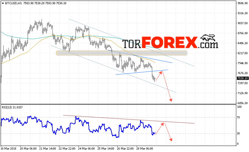 Таким образом, Курс Bitcoin прогноз и аналитика на 30 марта 2018 предполагает попытку теста области сопротивления вблизи уровня 7700 и продолжения падения с потенциальной целью на уровне 6900, дополнительным сигналом в пользу падения Bitcoin выступит тест линии тренда на индикаторе относительной силы, отменой варианта снижения котировок станет сильный рост и пробой области 8100.