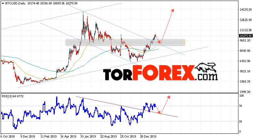Bitcoin BTC/USD завершает торговую неделю на уровне 10275 и продолжают движение в рамках сильного роста. Скользящие средние указывают на наличие бычьей тенденции. Цены смогли пробить область между сигнальных линий вверх, что указывает на сильное давление со стороны покупателей. На данный момент стоит ожидать попытку продолжения незначительной коррекции и тест области поддержки вблизи уровня 9405. Откуда вновь стоит ожидать отскок и продолжение роста курса Bitcoin с потенциальной целью выше уровня 14155.