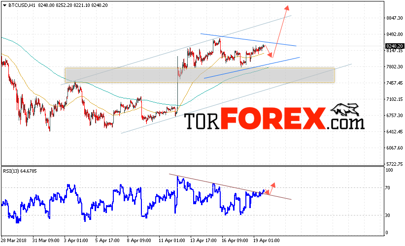 Таким образом, Bitcoin прогноз курса и аналитика на 20 апреля 2018 предполагает попытку теста уровня поддержки вблизи области 8150 и продолжения роста с потенциальной целью на уровне 9150, дополнительным сигналом в пользу роста Bitcoin выступит пробой линии тренда на индикаторе относительной силы, отменой варианта роста котировок станет падение и пробой области 7800.