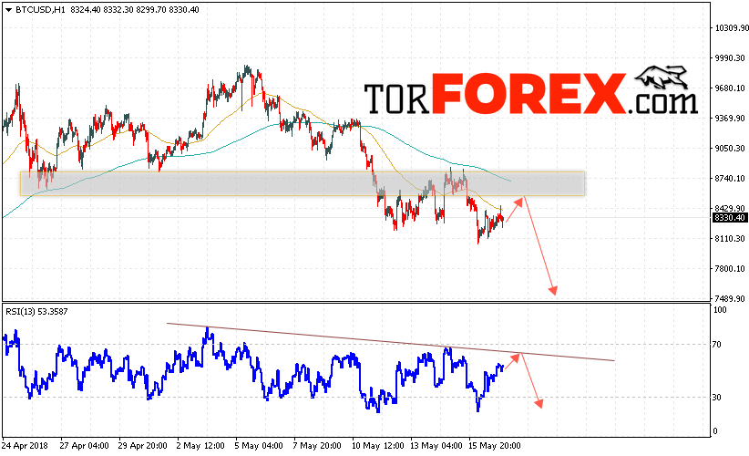 Таким образом, Bitcoin прогноз курса и аналитика на 18 мая 2018 предполагает попытку теста уровня сопротивления вблизи области 8500 и продолжения падения с потенциальной целью на уровне 7500, дополнительным сигналом в пользу падения Bitcoin выступит тест нисходящей линии тренда на индикаторе относительной силы, отменой варианта падения котировок криптовалюты станет сильный рост и пробой области 9050.