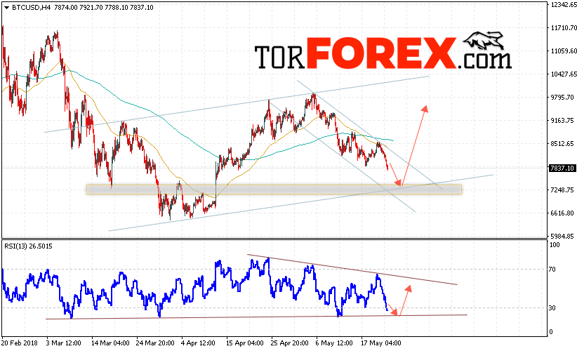 Таким образом, Bitcoin прогноз курса и аналитика на 24 мая 2018 предполагает попытку теста уровня поддержки вблизи области 8300 и продолжения роста с потенциальной целью на уровне 10400, дополнительным сигналом в пользу роста Bitcoin выступит тест линии тренда на индикаторе относительной силы, отменой варианта роста котировок криптовалюты станет падение и пробой области 6900.