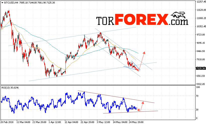 Таким образом, Bitcoin прогноз курса и аналитика на 30 мая 2018 предполагает попытку теста уровня поддержки вблизи области 7100 и продолжения роста с потенциальной целью на уровне 8400, дополнительным сигналом в пользу роста Bitcoin выступит тест линии тренда на индикаторе относительной силы, отменой варианта роста котировок криптовалюты станет падение и пробой области 6800, в этом случае стоит ожидать продолжения снижения Bitcoin.