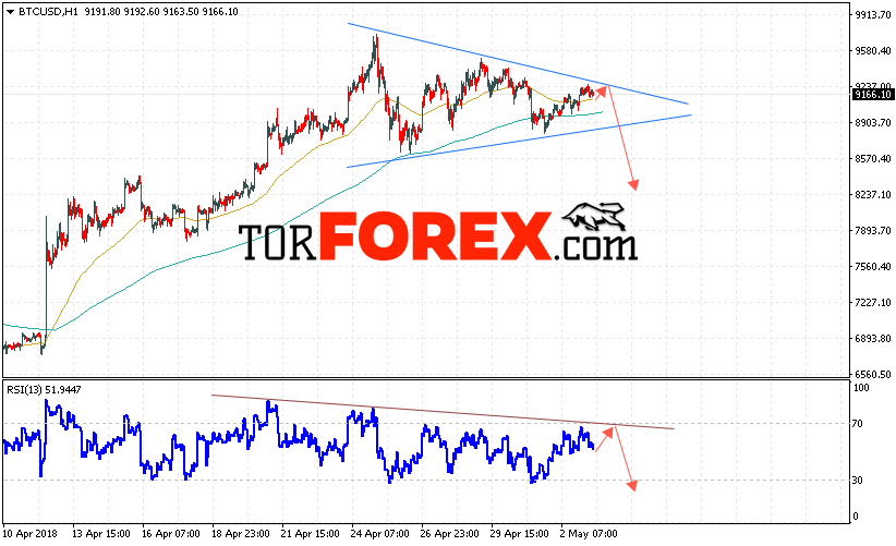 Таким образом, Bitcoin прогноз курса и аналитика на 4 мая 2018 предполагает попытку теста уровня сопротивления вблизи области 9250 и продолжения падения с потенциальной целью на уровне 8250, дополнительным сигналом в пользу падения Bitcoin выступит тест линии тренда на индикаторе относительной силы, отменой варианта падения котировок станет сильный рост и пробой области 9450.