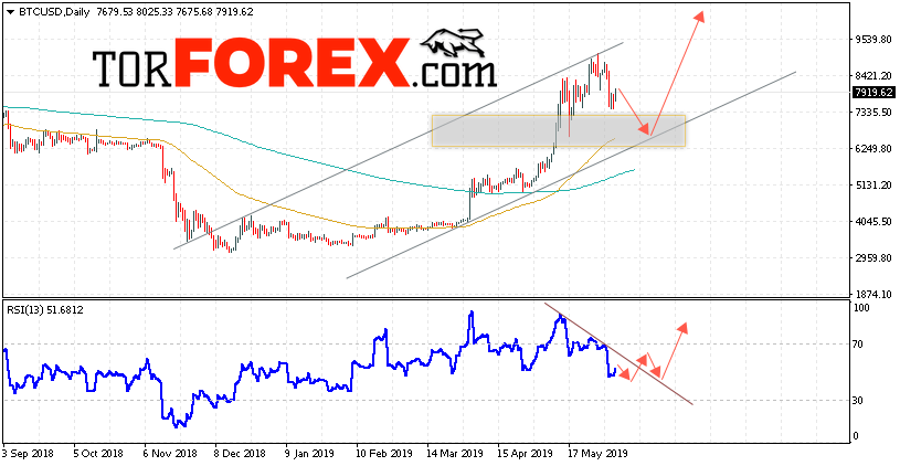 В пользу подъёма котировок BTC/USD на текущей торговой неделе 10 — 14 июня 2019 выступит пробой нисходящей линии тренда на индикаторе относительной силы. Вторым сигналом станет отскок от нижней границы восходящего канала. Отменой варианта роста Bitcoin станет падение и пробой области 6025. Это укажет на пробой нижней границы восходящего канала и продолжение падения BTC/USD с потенциальной целью ниже уровня 4850. Подтверждением развития восходящей тенденции выступит пробой области сопротивления и закрытие котировок выше уровня 9425.